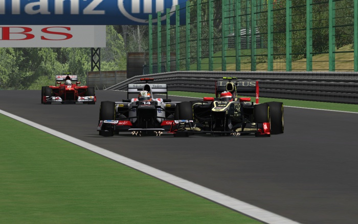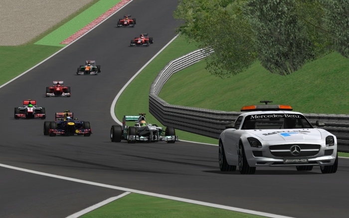 Rywalizacja została wstrzyma niecałą minutę później w wyniku wyjazdu samochodu bezpieczeństwa na tor. Przyczyną był mały karambol, który został spowodowany przez kolizję Patryka Rogozika i Cezarego Kołcza, a do rozbitych bolidów dołączył Łukasz Jasiński. Tylko ten ostatni miał szansę dojechać do alei serwisowej i po naprawie przedniego skrzydła kontynuować wyścig. Podczas okresu neutralizacji lider klasyfikacji w dość głupi sposób stracił prowadzenie w wyścigu. Patryk przesadził z rozgrzewaniem opon, postawił swój bolid bokiem i prawie zatrzymał się w miejscu, co zgodnie z zasadami wykorzystał Maciej Młynek.