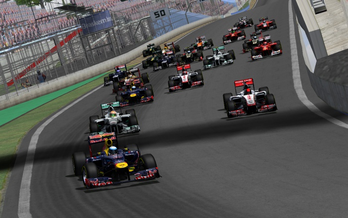 I ruszyli! Już na samym początku pierwszą lokatę traci Patryk Krutyj, który nie najlepiej reaguje na dość szybkie zniknięcie sygnalizacji świetlnej. Liderem zostaje Maciej Młynek. Dobrym startem popisuje się także Radosław Cupał, który wskakuje na trzecią lokatę. Tuż za nim znajdują się Adam Jurzysta oraz Sebastian Kosmala, a dalej podróżują kolejno: Łukasz Jasiński, Cezary Kołcz, Rafał Cupał, Patryk Rogozik oraz Jakub Brański zamykający czołową dziesiątkę. Poza nią mamy Dawida Czepielę, Dawida Kuszel, Patryka Łucków, Tomasza Bokuniewicza, Grzegorza Wolanina, Mateusza Kaczyńskiego, Marcina Jędrowiaka, a dwie ostatnie lokaty to Maciej Paruch oraz Marek Jabłoński. Byli oni jedynymi kierowcami, którzy uszkodzili swoje bolidy już na początku wyścigu. Marek utracił swój spojler na skutek kontaktu z Lotusem prowadzonym przez Dawida Kuszel, a Maciej nie zdołał uniknąć kontaktu z uszkodzonym Force India i również pożegnał się ze swoim przednim skrzydłem. Jak jednak po chwili się okazało, bolid Force India uległ poważniejszym uszkodzeniom i Marek był zmuszony wycofać się z wyścigu jeszcze przed ukończeniem pierwszego sektora.