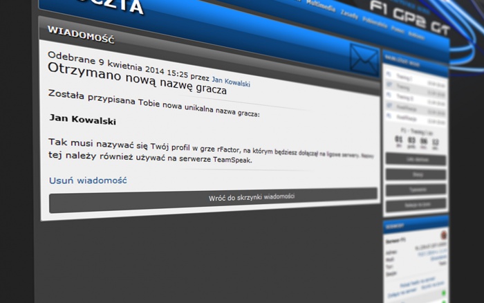 Od tej chwili każdy użytkownik po zalogowaniu się na stronie będzie miał przypisaną unikalną nazwę gracza. Nazwą tą domyślnie jest imię i nazwisko użytkownika z zamienionymi polskimi znakami na litery alfabetu łacińskiego z dopisaną na końcu liczbą w przypadku, gdy wielu użytkowników używa takiego samego imienia i nazwiska. Utworzona w ten sposób nazwa, podobnie jak pseudonim, jest unikalna i jednoznacznie identyfikuje użytkownika. I to właśnie niej, zamiast pseudonimu, trzeba będzie używać na serwerach rFactor oraz TeamSpeak.