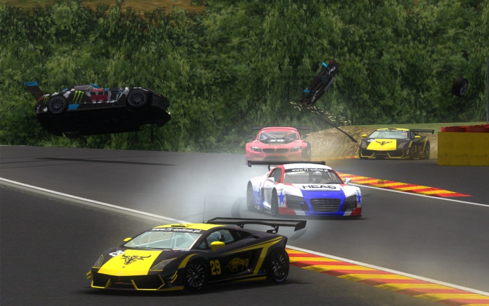 Pierwszą dziesiątkę zamknęli Radosław Bogusz, który nie najlepiej radził sobie w ten weekend, a w dodatku dostał karę za kolizję z Łukaszem Dams, oraz Marcel Grudziński. Ten pierwszy nie miał łatwego początku wyścigu. Najpierw zderzył się z Łukaszem, w wyniku czego ferrari obróciło się i uderzyło w Macieja Cabałę, potem toczył ostrą walkę z Marcelem, a w ostatnim zakręcie po kontakcie z Kaczyńskim stracił trochę czasu, przez co przed Eau Rouge atakowali go Paruch i Miłosz. Ten drugi wraz z Radkiem Boguszem ścięli tor i o ile kierowca FSP został do tego zmuszony przez rywala, o tyle on nie skończył na bandzie, w przeciwieństwie do kierowcy Polish Tigers. Sporo szczęścia miał tu Maciej Paruch, który znalazł się w samym centrum akcji i zdążył przejechać przez zakręt zanim odbijający się od barier samochód Miłosza przeciął tor jazdy. "Ofiarą" tego zdarzenia padł drugi z kierowców PTM, Adrian Pińczuk. Kierowca nie miał żadnych szans by uniknąć kolizji, która jego także wyeliminowała z wyścigu.