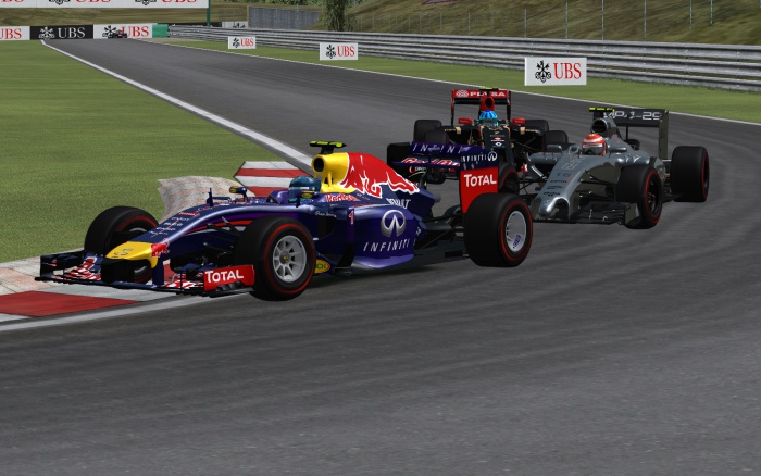 Na początku wyścigu skorzystałem z jej dużej ilości, gdzie Patryk Krutyj stracił spojler, przez pierwsze dwa stinty jechałem w pobliżu Adriana Babińskiego, który jednak miał ode mnie wyraźnie lepsze tempo i gdyby miał dzisiaj trochę więcej szczęścia mógłby walczyć nawet o zwycięstwo. Niestety na moim trzecim stincie na oponach typu super-soft utknąłem za moim kierowcą Jackiem Hamburgiem, który jechał na mediumach. Nie było możliwości go wyprzedzić nigdzie, fantastycznie się bronił, a straciłem za nim ponad połowę swojego stintu, a nawet prawie 3/4. To przekreśliło moje szanse na skończenie wyścigu w TOP5, a przez ponad połowę wyścigu w niej się znajdowałem. Na ostatni stint założyłem mediumy, a tempo na nich było tragiczne, gdyż niestety nie testowałem jazdy na nich przed wyścigiem, a w wolnych zakrętach bolid bardzo się ślizgał i nie mogłem nic z tym zrobić. Pod koniec wyścigu stoczyłem bardzo pasjonującą walkę z czterokrotnym mistrzem serii F1 - Patrykiem Krutyjem, którą udało mi się wygrać i obronić siódmą lokatę. Początkowo nie wierzyłem w powodzenie tej walki, jednak na mecie bardzo się ucieszyłem i osłodziło mi trochę ten wyścig. Po mecie jednak Patryk napisał, że na ostatnim okrążeniu musiał sporo odpuścić, bo brakowało mu paliwa. Bardzo szkoda mi też moich kierowców - Jacka Hamburga, który po kontakcie z Mateuszem Dąbrowskim stracił przedni spojler i spadł poza punktowaną dziesiątkę, a jechał prawdopodobnie po P3, oraz Maćka Młynka, który podobnie jak ja na oponach medium miał ogromne problemy w tym wyścigu, jednak nawet jeszcze większe niż ja. Mam nadzieję, że za tydzień w SPA będę jeszcze bardziej konkurencyjny i powalczę nawet o pierwszą piątkę w wyścigu.
