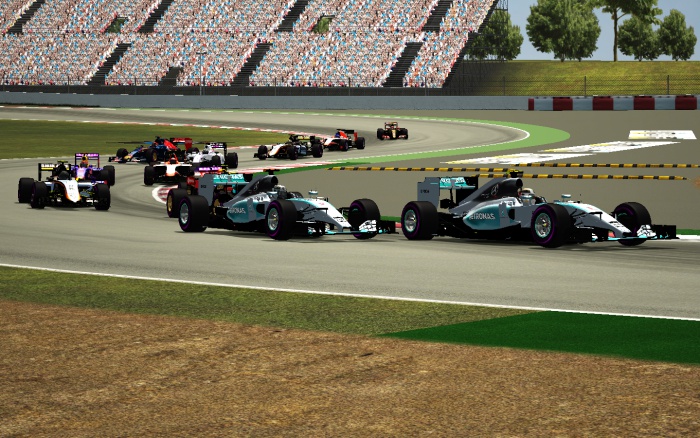 Start, co cieszy, ponownie przebiegł spokojnie i bez większych problemów. Pierwsze miejsce stracił jeszcze przed pierwszą sekcją zakrętów Adrian Babiński, który wzięty w kleszcze przez kierowców Mercedesa spadł na trzecią lokatę, a następnie jeszcze nieco dalej. Genialnie ruszył Konrad Żerebiec (Force India), który przez chwilę walczył o P2, ale ostatecznie znalazł się tuż za plecami Marcela Pawińskiego (Mercedes), także przed Babińskim. Dobry start zaliczył też Rafał Cupał, który znalazł się tuż za plecami swojego kolegi z Red Bulla i awansował na P6. Słabo wyruszył Jacek Hamburg, który atakując Macieja Żmudzińskiego w walce o P10 na końcu S2 obrócił się spadając na koniec stawki. Na drugim okrążeniu Adrian Babiński pod koniec prostej start-meta zaatakował pomyślnie Konrad Żerebca awansując na prowizoryczne podium. Kierowca Lotusa nie zwalniał tempa i chciał odzyskać co stracił. Na kolejnych okrążeniach dogonił i poradził sobie z Pawińskim w krętej partii toru. Już wtedy było widać, iż Babiński ma ustawione auto pod docisk i wolne sektory, zaś Mercedesy celowały bardziej w prędkość. Powoli do TOP 10 dobijał się Jacek Hamburg goniąc Dawida Czepielę i Aleksego Mainusza (Williams). Rafał Cupał po problemach z trakcją zalicza na tym stincie spin, przez co traci bezpośredni kontakt z czołówką wyścigu.