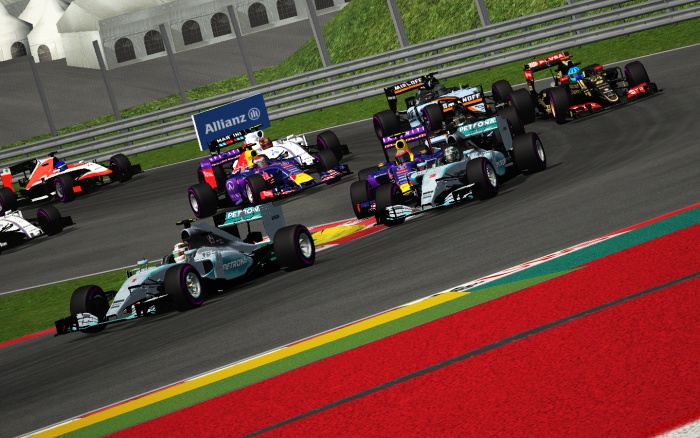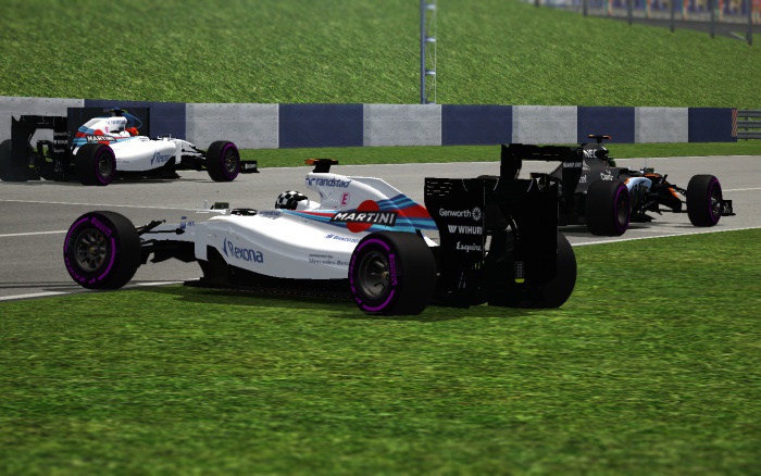 Świetny start zaliczył, jak zwykle, Marcel Pawiński, który już po kilku zakrętach znalazł się na pierwszej pozycji tuż przed swoim kolegą z zespołu. Za nimi jak cień podążał Maciej Wysmulski na szybszych oponach, nie potrafiąc jednak znaleźć sposobu na duet Mercedesa. Dalej wywiązała się ciekawa walka pomiędzy kierowcami Force India oraz Adrianem Babińskim. Ostatecznie kierowca Lotusa poradził sobie z reprezentantami hinduskiej stajni i mógł kontynuować pogoń za TOP3. Konrad Żerebiec pewnie plasował się na miejscu piątym. Za nim walka czwórki kierowców: Dawida Czepieli, Damiana Wolkiewicza, Aleksego Mainusza oraz Rafała Cupała. Kierowcy jechali blisko siebie i niestety w pewnym momencie błąd zawodnika Force India spowodował dość groźnie wyglądający wypadek. Dawid zatrzymał się na zdradliwej tarce, następnie jego bolid bezwładnie rzuciło wprost pod pędzącego Aleksego Mainusza. Kierowca Williamsa był drugim zawodnikiem, który stracił przednie skrzydło. Jako pierwszy dokonał tego Maciej Żmudziński. Reprezentant Marussi już na drugim okrążeniu przestrzelił dohamowanie i zahaczył o tył bolidu Mainusza. Podobny błąd, jaki przytrafił się Dawidowi, spotkał Macieja Wysmulskiego. Kierowca stracił trochę czasu, ale jego bolid nie został uszkodzony.