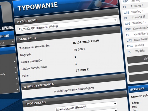 Kilka tygodni temu Rafał Cupał, pod naciskiem niemal całej ligi, ogłosił, że pod koniec marca będzie można ponownie typować wyniki nie tylko wyścigu, ale również kwalifikacji. Typer na dawnej stronie cieszył się ogromną popularnością. Co tydzień, setki tysięcy wirtualnych euro przelewały się przez tą aplikację. Wielu straciło, ale również wielu zyskało. Były momenty, w których typer pomógł zespołom kupić ulepszenie bolidu. Dziś, po 9 miesiącach, typowanie powróciło do naszej ligi. Nowością, w porównaniu ze starszą wersją, jest możliwość obstawiania wyników dowolnej sesji i dowolnej ilości zawodników. Te liczby zależne są jednak od szefów serii, którzy są odpowiedzialni za funkcjonowanie tej aplikacji w swoich seriach. Teraz, aż połowa uczestników jest nagrodzona, a szansa na wygraną jest większa. Zapraszamy do obstawiania swoich faworytów!