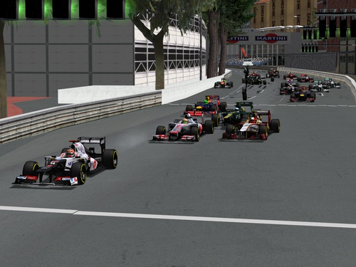 Zapowiadany przez wszystkich chaos w wyścigu na tym niezwykle wymagającym torze zaczął się jeszcze przed startem. Pod koniec okrążenia formującego swój bolid uszkodził Daniel Koziński. Mimo braku przedniego spojlera, kierowca Caterhama ustawił się na swojej pozycji startowej. Po zgaśnięciu czerwonych świateł okazało się jednak, że wcale nie oznaczało to, że zamierza on normalnie wystartować. Podczas gdy pozostałe bolidy pomknęły w stronę pierwszego zakrętu, Caterham Daniela stał w miejscu. Ominąć go nie zdołali: Cezary Kołcz (Williams), Rafał Cupał (Williams) oraz Karol Bednarczyk (Ferrari). Tylko ten pierwszy był w stanie kontynuować jazdę, dla pozostałych był to już koniec rywalizacji w GP Monako.