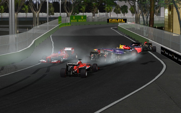 W połowie pierwszego okrążenia, na zakręcie numer 10 doszło do małego karambolu. Jego sprawcą był Adam Jurzysta, który uderzył i obrócił bolid Ferrari prowadzony przez jadącego na 7. miejscu Łukasza Damsa. Po chwili w spowolnionego Lotusa uderzył Dawid Czepiela, a w niego wjechał Patryk Gerber. W incydencie tym tylko bolid Red Bulla prowadzony przez Dawida został uszkodzony i wymagał wizyty u mechaników.