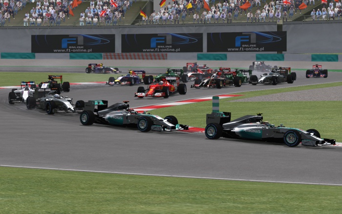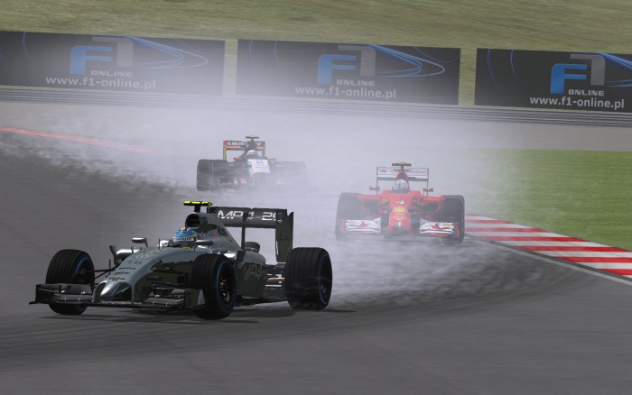 Rafał Cupał (P4): To był bardzo długi i trudny wyścig. Deszcz zaskoczył mnie tak jak innych, choć właściwie trochę się go spodziewałem i przygotowałem podstawowe poprawki w ustawieniach jeszcze zanim zaczęło padać. Start był bardzo udany, szybko znalazłem się na drugim miejscu za Patrykiem, a potem utrzymywałem całkiem dobre tempo. Problemy zaczęły się na końcu pierwszego stintu. Gdy Marcel Pawiński zjechał do alei po zmianę opon, ja musiałem przejechać jeszcze jedno okrążenie i to jak najszybciej, żeby jak najmniej stracić na tej próbie podcięcia przez kierowcę Williamsa, której sukces był niemal pewny, bo mój bolid już prowadził się fatalnie. Dlatego sam nie wykonałem wcześniej postoju, bo uważałem wykonanie dłuższego drugiego stintu na deszczowych oponach za szaleństwo. Niestety moje ostatnie okrążenie przed zjazdem było bardziej pływaniem niż jazdą i straty były ogromne. Później walczyłem z Mateuszem Dąbrowskim, który wraz z zużyciem moich opon coraz bardziej się do mnie zbliżał. Najwidoczniej mój bolid lub styl jazdy był wyjątkowo nieprzyjazny dla ogumienia. Walkę o trzecie miejsce zakłócił TeamSpeak, który kolejny raz niespodziewanie umarł minimalizując grę - całe szczęście, że miało to miejsce na wyjściu z wolnego zakrętu i po chwili mogłem powrócić do jazdy i dojechać na tym czwartym miejscu. Wyścig mógł się ułożyć trochę lepiej, ale nasi kluczowi rywale mieli jeszcze większe problemy, dzięki czemu Mercedes znów mocno odskoczył od reszty stawki, dlatego jestem zadowolony.