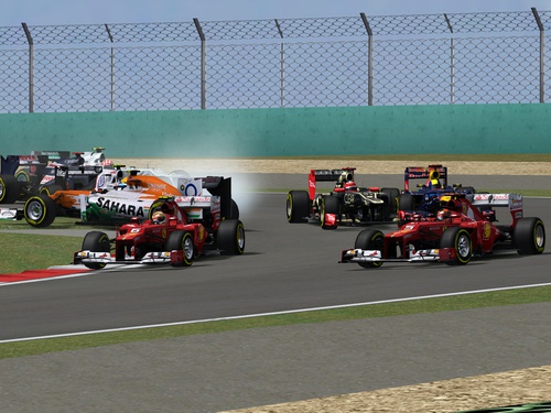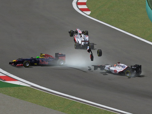 Na drugim okrążeniu doszło do pierwszej poważnej kolizji. W bolid Ferrari Dawida Kowala, w wyniku zbyt późnego hamowania, wjechał Sauber Artura Litwina. Największym poszkodowanym w tym wypadku był jednak sam winowajca, który zmuszony został do naprawy przedniego skrzydła.