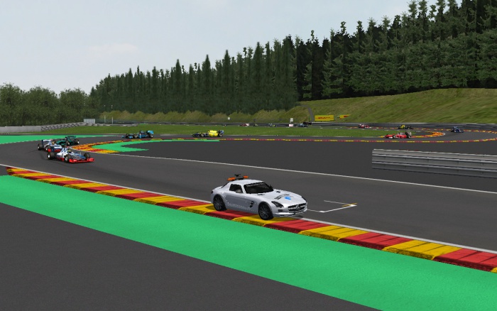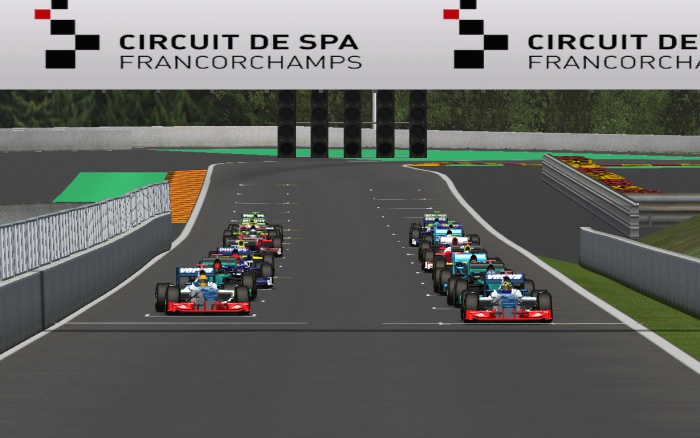 Pierwszy zakręt, mimo iż jest szeroki z asfaltowymi poboczami, jest dość trudny do pokonania. Głównie dlatego, że jest bardzo wolny i punkt dohamowania znajduje się stosunkowo blisko linii startu. Obawiano się, że dojdzie tam to sporej ilości kolizji. Tak jak to było w II 2011. Na szczęście do tego nie doszło w TYM miejscu. Wypadki wydarzyły się kilkaset metrów dalej, na słynnym zakręcie Eau Rouge. Inicjatorem reakcji łańcuchowej był Szymon Kmiecik, który za szybko wpadł w drugi zakręt na tym wzniesieniu, co przy draftingu spowodowanym sąsiedztwem innych bolidów i nierozgrzanymi oponami, doprowadziło do dużej podsterowności, efektem której była kolizja z amortyzującymi oponami. Wyścigówka Huawei Racing najpierw odbiła się od tych, które stały po lewej stronie toru, a następnie tych po prawej. Łukasz Czerwiński z Gazprom Lada cudem uniknął kolizji z przelatującym nad torem Kmiecikiem. Dokładnie tak samo jak Szymon, swoją przygodę z wyścigiem zakończył Maciej Paruch. Jednak on „zdołał upolować ofiary”. Był nim duet DFP. Najpierw w Maćka uderzył Dawid Bęgier, a potem w skutek rykoszetu oberwał Marek Jabłoński. Pierwszy w przeciwieństwie do drugiego zdołał kontynuować jazdę. Te sytuacje zmusiły kontrolę sesji do wypuszczenia na tor samochodu bezpieczeństwa.