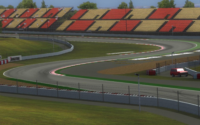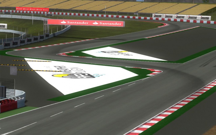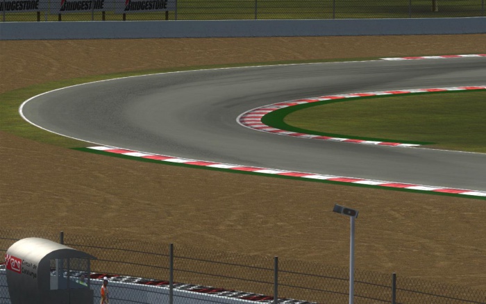 Pierwszy sektor toru to trzy szybkie zakręty. Po prostej startowej mamy zakręt Total, by po chwili wjechać w Abolafio, a potem po prostej wjechać w łukowatą trójkę. Bardziej kręty sektor drugi zaczynamy na dojeździe do zakrętu 4. Po tym zakręcie mamy prostą prowadzącą to pierwszego wolnego zakrętu, który oznaczony jest numerem 5. Następnie prosta i szybki zakręt 6. Do zakrętu TV3 odejmujemy gaz, aby później szybko wjechać w Placo-Saint Gobain. Po nim jest prosta, po której mamy lekkie odjęcie do dziewiątki, po której wjedziemy na drugą co do długości prostą toru. Jest tam dobre miejsce do przepuszczenia szybszego kierowcy, gdyż dublowany kierowca może przejechać przez fragment toru używany w krótszej konfiguracji. W połowie prostej rozpoczyna się ostatni, dosyć kręty, trzeci sektor. Pierwszy zakręt w tej sekcji, La Caixa jest dosyć trudny, ale jeżeli przestrzelimy punkt hamowania możemy wyjechać poza tor i spokojnie wrócić na asfalt. Zakręty 11 i 12 są pokonywane ze średnią prędkością. Kolejny zakręt, Europcar, prowadzi na prostą prowadzącą do Chicane RACC. Na końcu okrążenia jest szybkie Turisme de Catalunya.