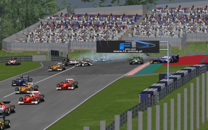 Cezaremu Kołczowi startującemu z PP udało się obronić pierwsze miejsce aż do drugiego zakrętu gdzie się obrócił i spadł na koniec stawki i to Radosław Cupał (Burnee) zyskał prowadzenie. W międzyczasie Dawid Głowski (Ferrari Marlboro) za bardzo opóźnił hamowanie i uderzył w Dawida Płonkę, który również spadł na koniec stawki.