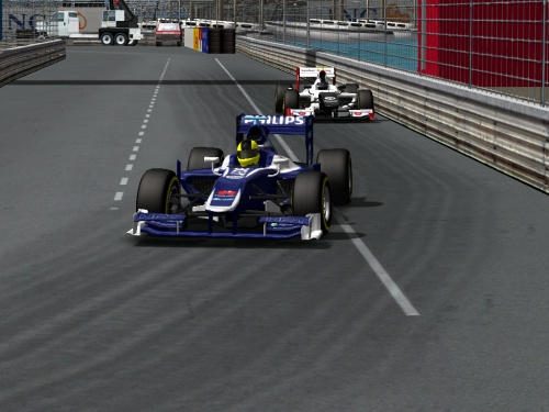 W środku stawki problemy z oponami mieli Mateusz Kaczyński i Radosław Cupał. Zawodnik AIR GP2 przebił lewą tylną na pierwszym zakręcie, natomiast Radek złapał „kapcia” uderzając o bandę w zakręcie Tabac. Natomiast z przodu na prowadzenie wysunął się Młynek. Doszło wtedy do bardzo niebezpiecznego zdarzenia. Manewr wyprzedzania nastąpił na szybkich łukach w pierwszym sektorze. Gdy Maciek i Patryk Ł. Zrównali się ze sobą, jadący przed nimi Karol Piękoś, któremu pokazała się niebieska flaga, znacząco zwolnił. Łucków minął bolid Saubera o kilka centymetrów. Jednak jego agresywna postawa nie pozwoliła mu utrzymać prowadzenia w wyścigu. Szybko jednak powrócił na fotel lidera, ponieważ po raz drugi pecha w pit-lane miał Młynek, tym razem ze strony jego teammate. I znów Maciej wyjechał za reprezentantem Philipsa. Wydawało się, że historia się powtórzy, gdyż zawodnik Vervy zbliżał się do rywala. Jednak wtedy pojawił się komunikat: „SC na torze! Zachować odstępy!”. Powodem tego był rozbity bolid Mateusza Kaczyńskiego stojący na środku toru. Było to na dwa okrążenia przed metą, a to oznaczało, że kierowcy dojadą do mety za SC. Teoretycznie wszystko było jasne. Jednak Mateusz Tryba za bardzo się rozluźnił. Najpierw stracił przedni spojler przed tunelem, a kilka chwil później pozbył się tylnego. Doszło do tego uszkodzone zawieszenie, co doprowadziło do przedwczesnego zakończenia rywalizacji.